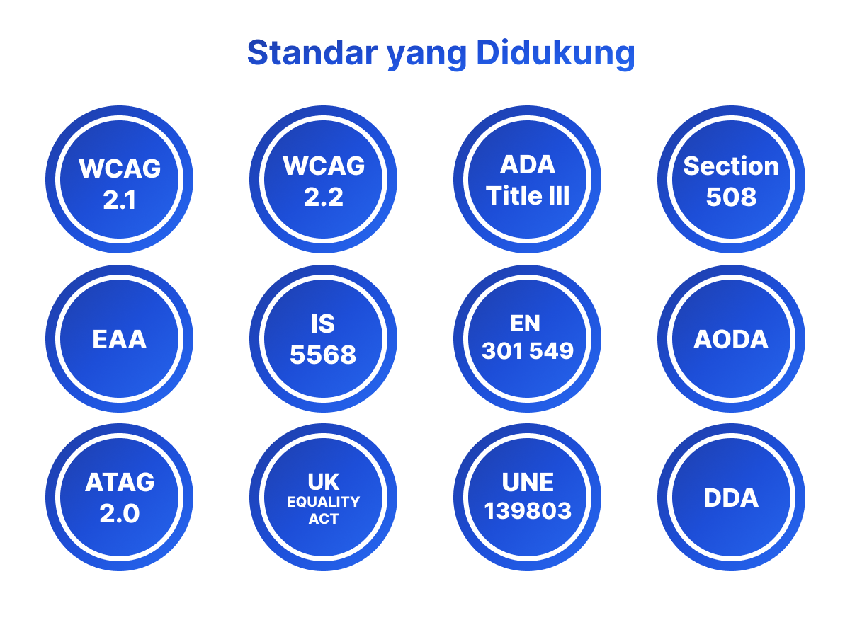 Widget Aksesibilitas AxOrigin meningkatkan kepatuhan situs web dengan peraturan ADA dan meningkatkan pengalaman penelusuran sesuai dengan berbagai standar aksesibilitas, termasuk WCAG 2.0, 2.1, dan 2.2; Bagian 508; Undang-Undang Unruh California; RGAA Prancis; EAA EN 301 549 Eropa; UNE 139803:2012 Spanyol; Undang-Undang Kesetaraan (EA) Inggris; DDA Australia; Standar 5568 Israel; AODA Ontario; ACA Kanada; BITV Jerman; Undang-Undang Inklusi Brasil (LBI 13.146/2015); JIS X 8341 Jepang; Undang-Undang Stanca Italia; dan Standar DDA Swiss